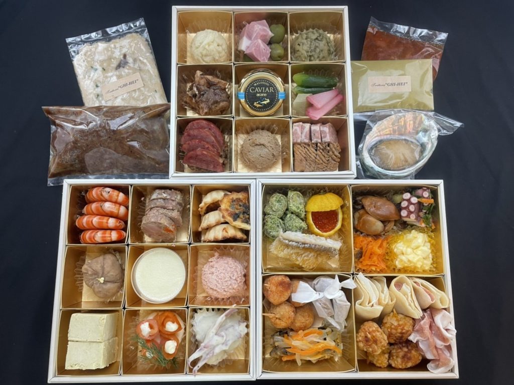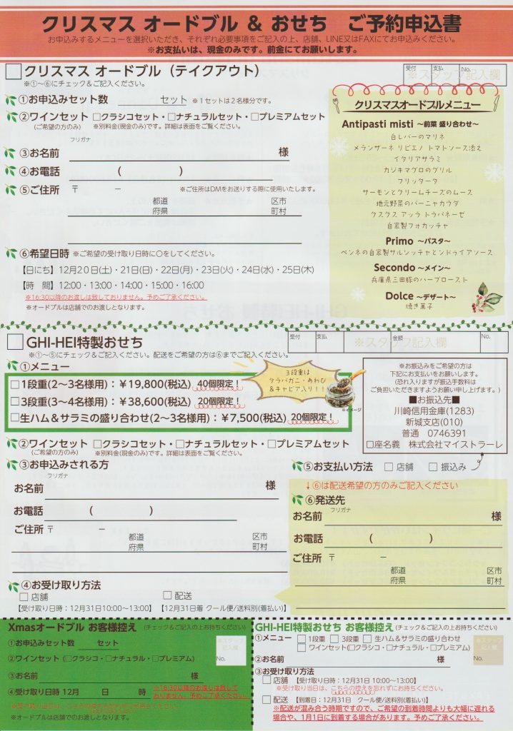 2025年10月2日 / 最終更新日時 : 2025年10月2日 wpmaster 未分類 ☆GHI-HEI特製おせち☆早割り特典は11月9日まで! 【3~4名様用】3段重 ※イメージです 【2~3名様用】1段重 ※イメージです 保存料を一切使用せず素材にとことん拘わった、真心こめて仕上げるイタリアンおせちです。今年もおせちにあわせたワインもご用意しております。ぜひ、おせちとご一緒にお申込みください♪◇◆お品書き◆◇◆◇◆◇◆◇◆◇◆◇◆◇◆イタリアンおせち2~3名様用(1段重)¥19,800(税込)3~4名様用(3段重)¥38,600(税込)◆生ハム&サラミの盛り合わせ2~3名様用 ¥7,500(税込)◆ワインセットクラシコワインセット(白&赤セット) ¥10,000(税込)ナチュラルワインセット(白&赤セット) ¥10,000(税込)プレミアムワインセット(白&赤セット) ¥20,000(税込)◆◇◆◇◆◇◆◇◆◇◆◇◆◇◆◇◆◇◆◇□予約期間 10月2日(木)~12月14日(日)★早割り特典★11月9日(日)までにご予約&お支払いされた方限定!! ☆彡2~3名様用をご購入の方☆彡 ディナー5%OFFチケットプレゼント!! ☆彡2~3名様用をご購入の方☆彡 ボトルワイン1本又はディナー10%OFFチケットプレゼント!!※現金でお支払いされた方限定です。□お渡し日時 【お店】12月31日(水)10:00~13:00 【配送】12月31日(水)到着(クール便/送料は着払いでお願いしております)□予約方法 下記用紙にご記入の上、①店舗 ②LINE ③FAXにてお申込みください。※お支払いは現金のみとなります。※早割り特典は、11月9日までにご予約&現金でのお支払いをされた方限定です。なお、チケットは12月31日のおせちと共にお渡しいたします。※クール便をご希望の方はお申しつけください(別料金)。なお、配送が混みあう時期ですので、ご希望の到着時間よりも大幅に遅れる場合や、1月1日に到着する場合があります。予めご了承ください。 FacebookXBlueskyHatenaCopy